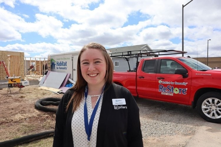 2024 Homebuyer, Brittany, has been a long-time volunteer of 13 years at Pillars – an organization committed to providing support and shelter for those experiencing homelessness or facing housing insecurity. After years of volunteering her time and dedication to their organization, Pillars staff had the opportunity to pay it forward to Brittany and volunteer on the Habitat build site of her soon-to-be home.